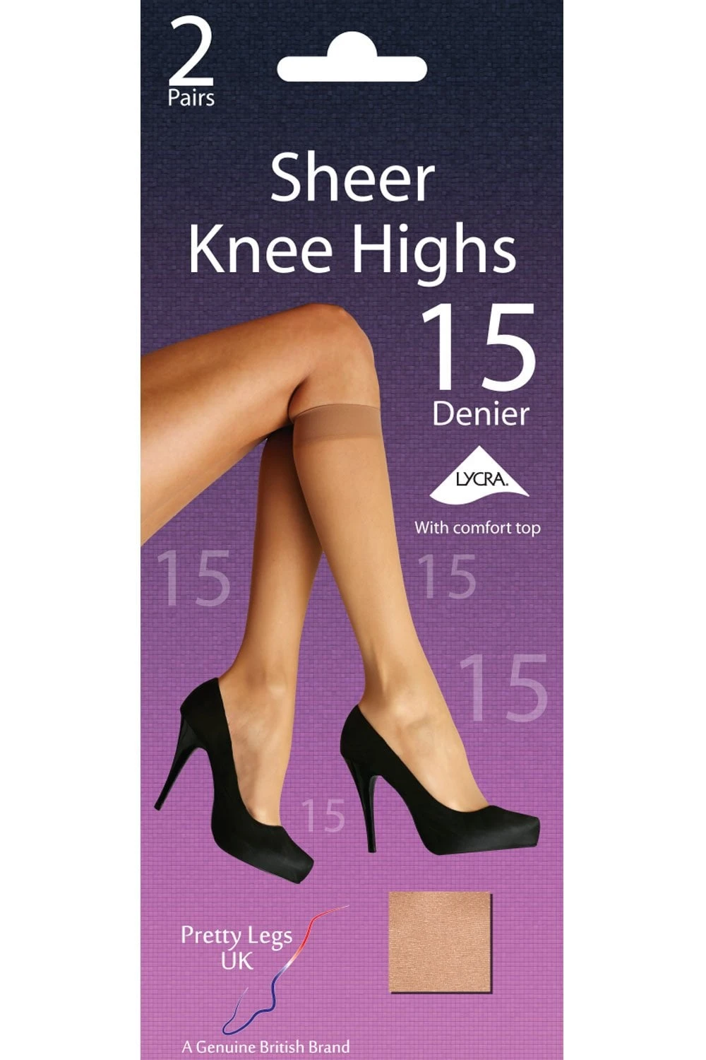 Pretty Legs 15 Denier Lycra Knee Highs. Sheer knee highs made with Lycra fibre which offers improved comfort and fit, along with the comfort top. The reinforced toe offers extra durability for all day wear.