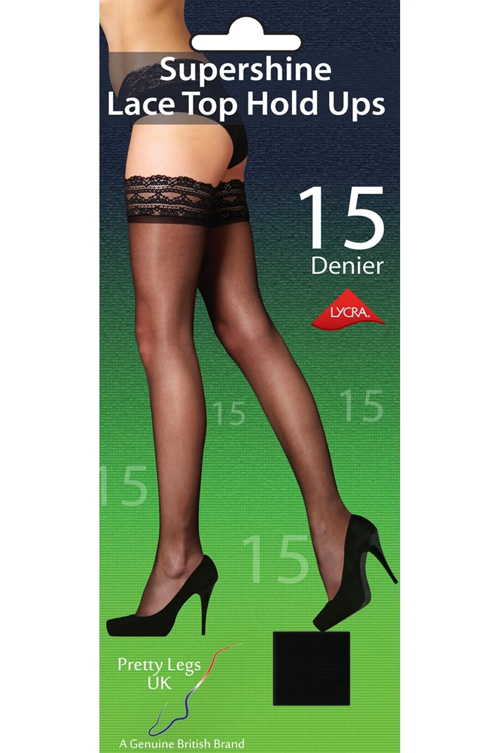 Pretty Legs 15 Denier Supershine Holdups. These sheer holdups have a lovely lace top and a shiny appearance. Great for any occasion day or night. The LYCRA® fibre content gives improved comfort and fit and a silicone top ensures they should stay in place. These have a sandal toe so can be worn with sandals or peep toes. The lace top may vary from the photograph.
