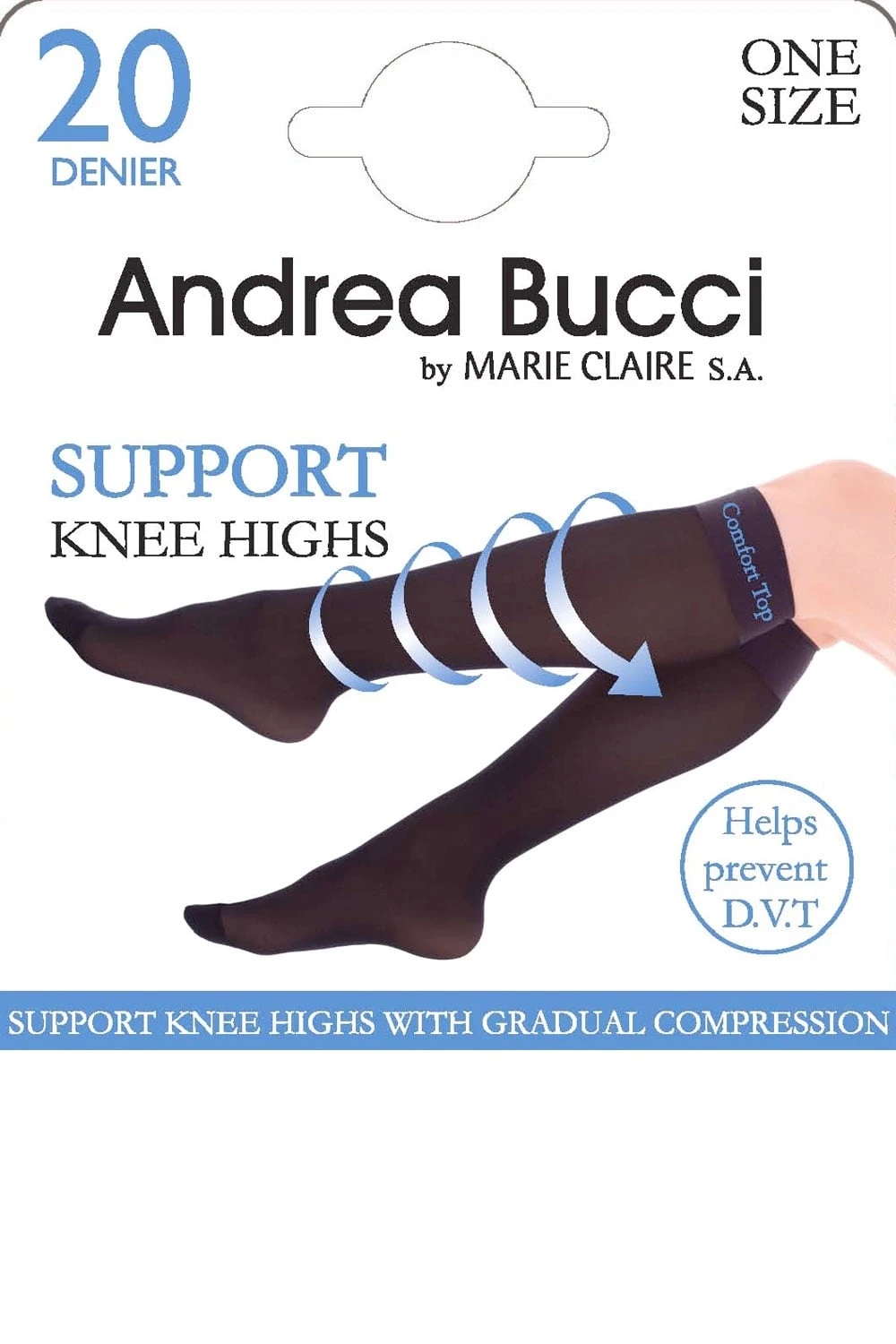 30 Denier Support Knee Highs from Andrea Bucci. Graduated support knee highs helping maintain regular blood flow providing relief from tired, swollen and or aching legs thought the day.
