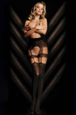 325 Sheer Dots Fashion Hold Ups. These stunning hold ups from Ballerina are a timeless classic. Forever on trend, spots and dots can transform a drab ensemble into a showstopper. The bold and daring black on nude is a fashionable chance from the usual all black designs, allowing you to match these stay ups with a whole new array of outfits. The band features a delicate nude floral and diamond motif, which contrasts with the dots with perfection.