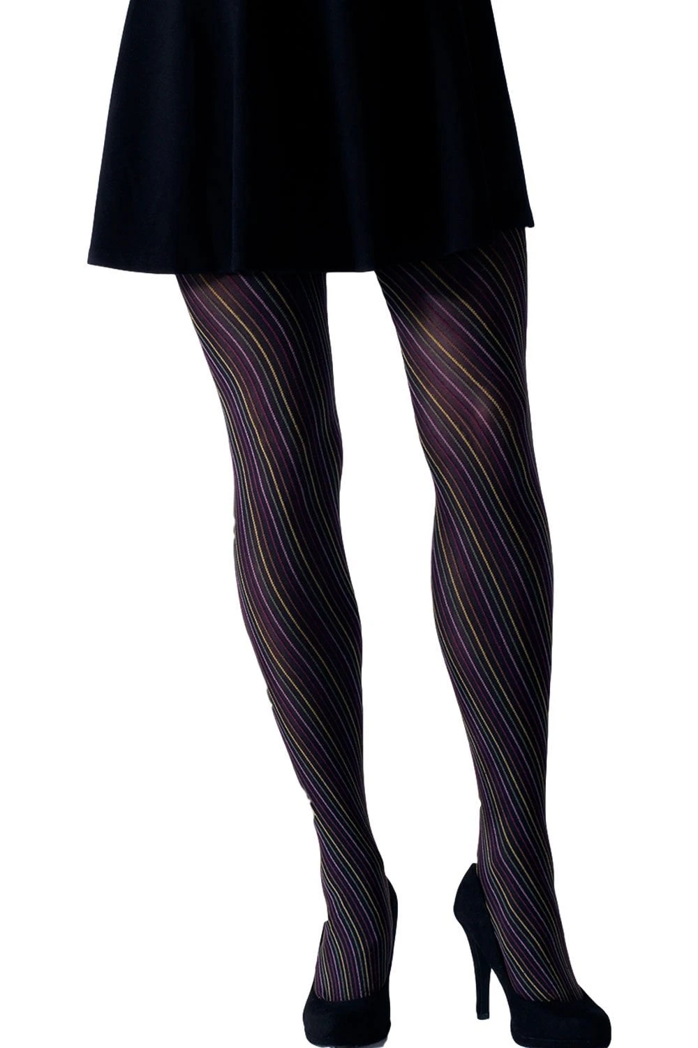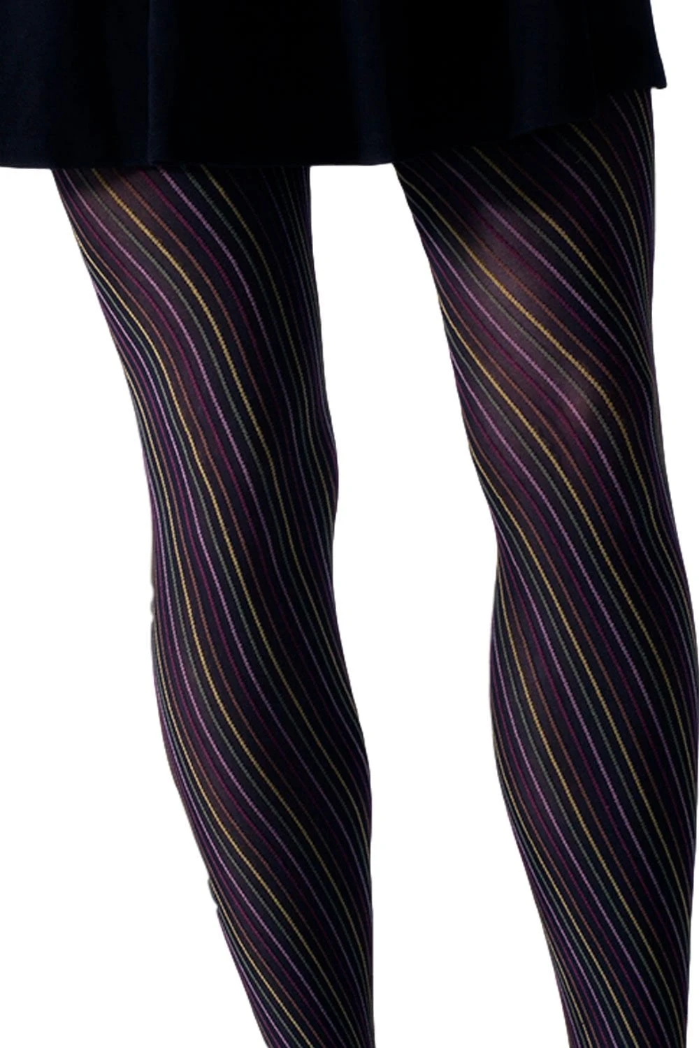 Multi-Coloured Spiral Tights from Gipsy. These black opaque tights by Gipsy are decorated with a multi coloured spiral effect. Muted coloured lines in pink, green, red, yellow and brown twist up and round your leg ending at the top of the thigh. These quirky tights are ideal to add a touch of colour and fun to any outfit.