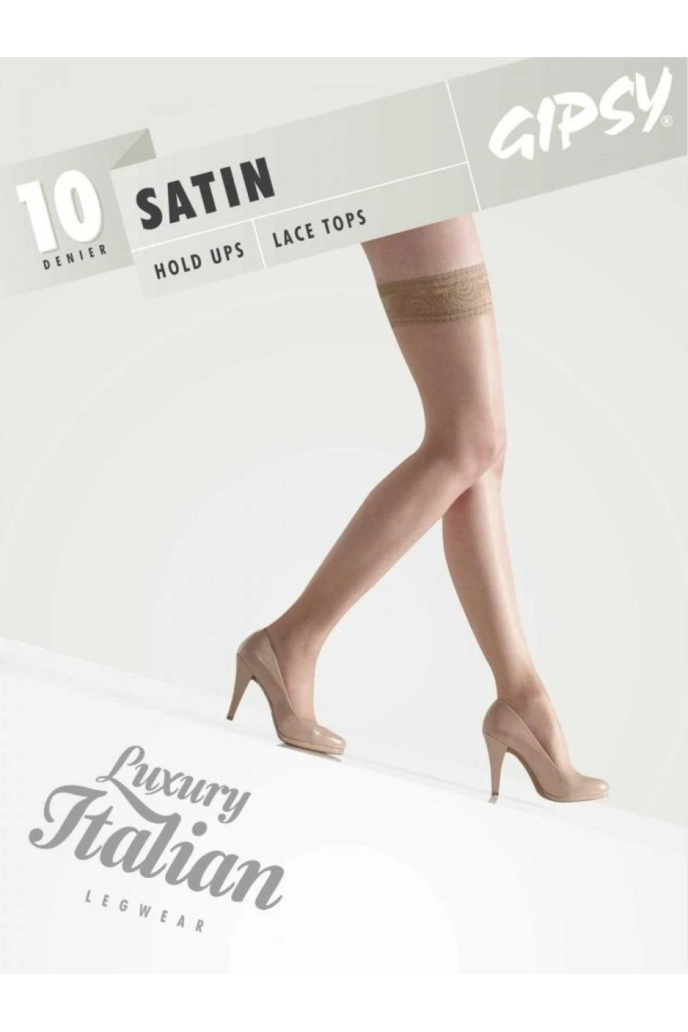 Satin Luxury Lace Hold Ups Lace Top from Gipsy. Superb lace top hold ups with a lovely soft shine appearance. These are 10 denier and come with flat seams for extra comfort and have sheer reinforced toes.