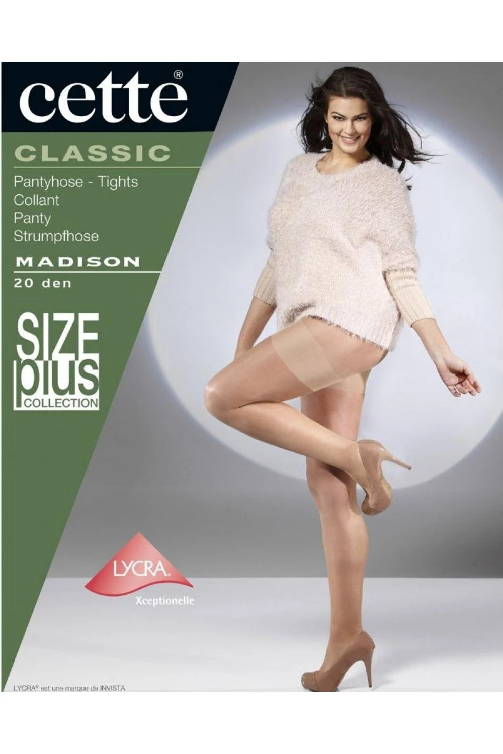 Madison 20 Denier Plus Size Tights from Cette. Elegant sheer tights made especially for larger sizes. Made with an extra panel with support for the bottom and heavier denier reinforcement to prevent chafing around the thigh area and increase the durability. Cotton gusset and reinforced toes complete these amazing tights.