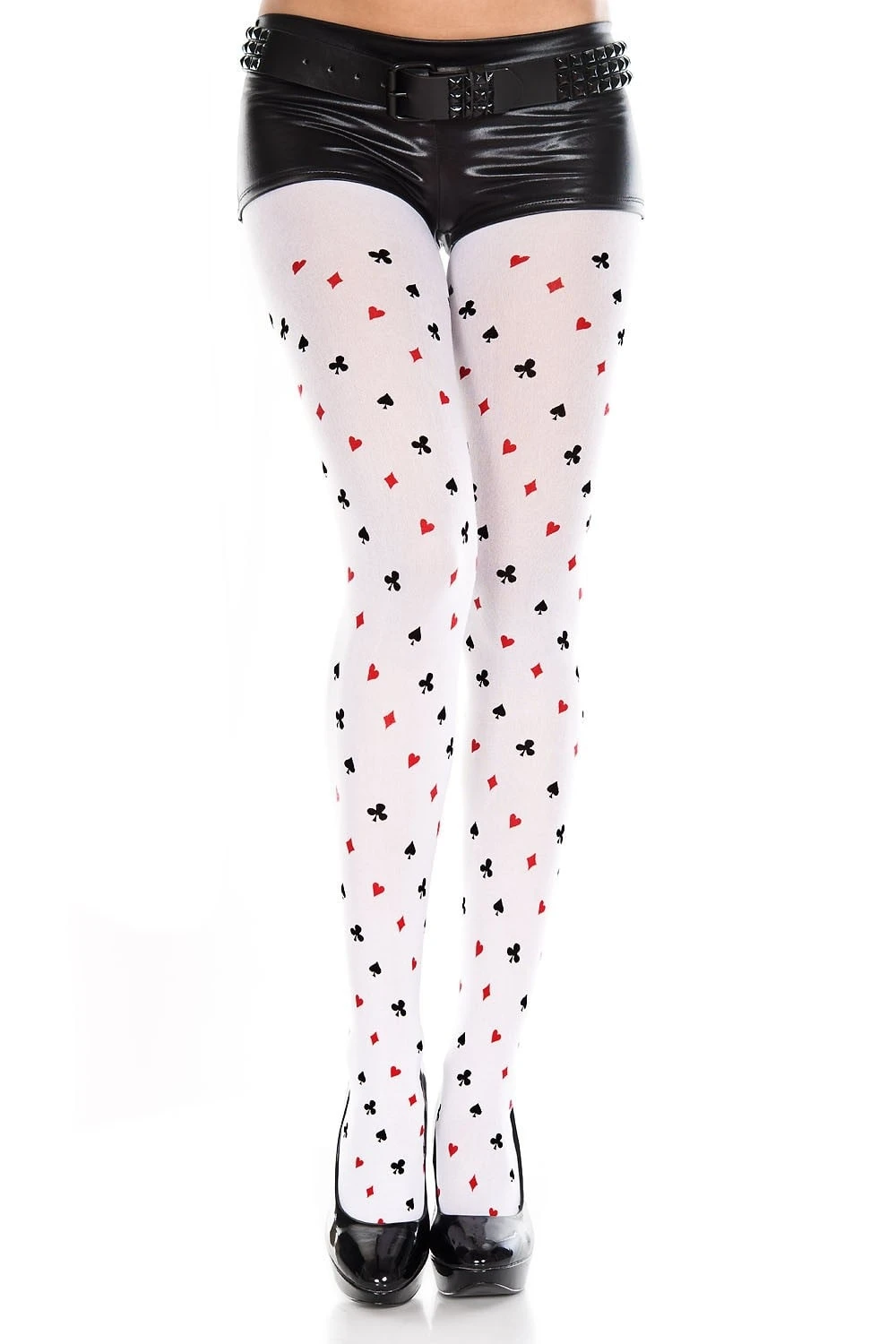 The four suits from a pack of playing cards feature as the all over design. Play your cards right when wearing these fun tights.