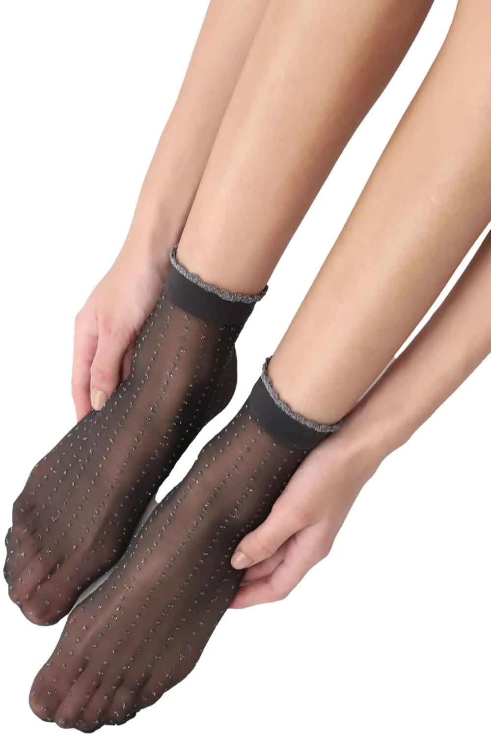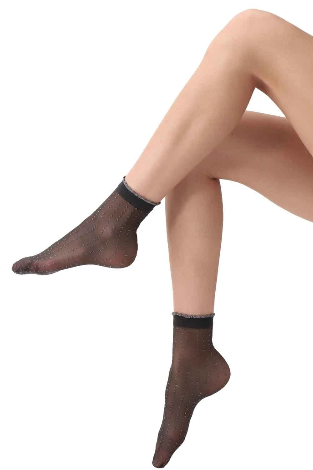 Sheer polka-dot lamé sock and cuff with shiny caps. Lots of stunning details, masterfully combined to create a classy accessory. These socks will look perfect worn with heels this party season.