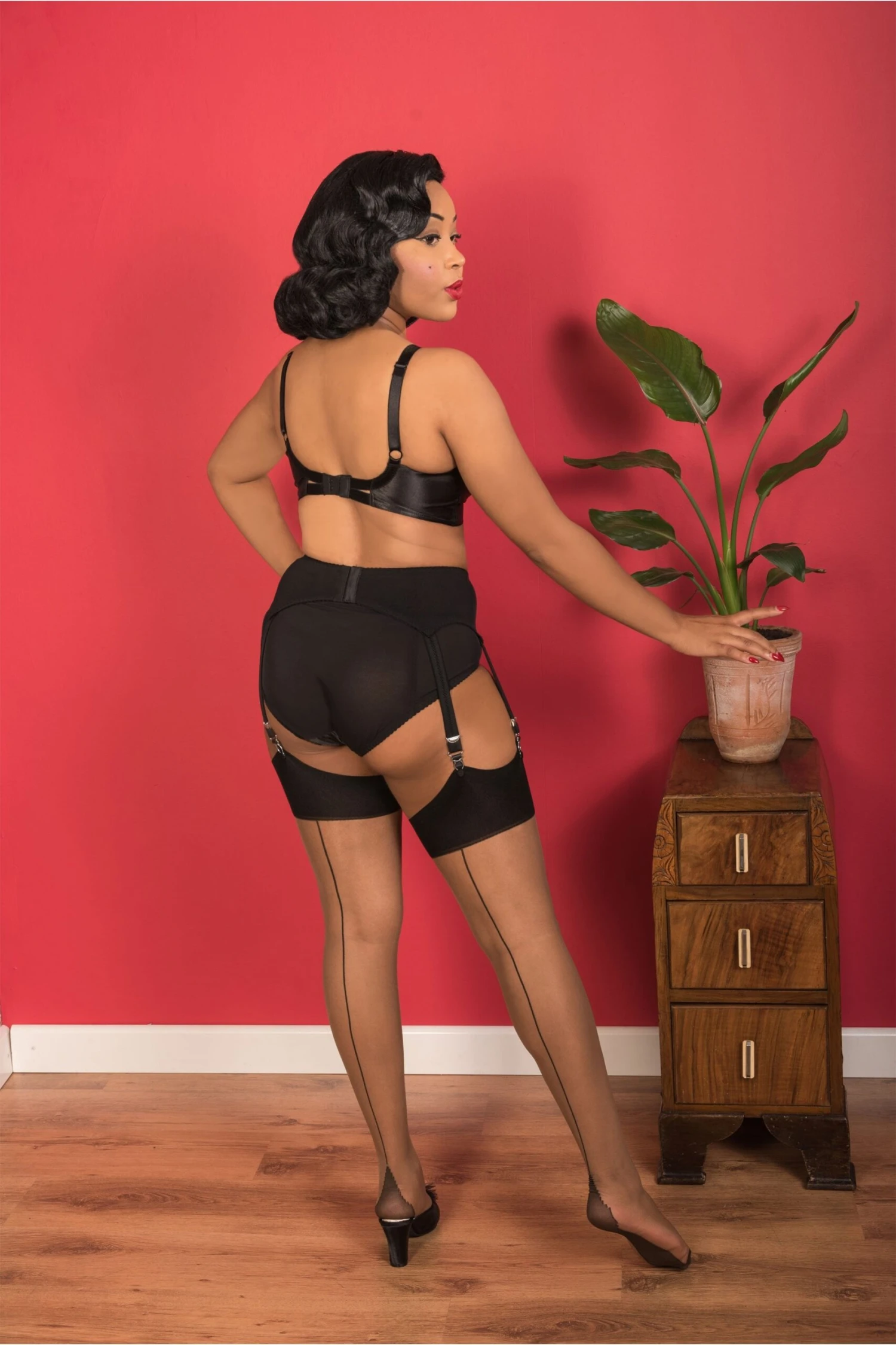 Seamed Stockings Nutmeg/Black H2053 from What Katie Did. These contrast black seamed stockings come in 15 denier seamed with a translucent nutmeg leg and black point heel, seam and deep retro style welt.